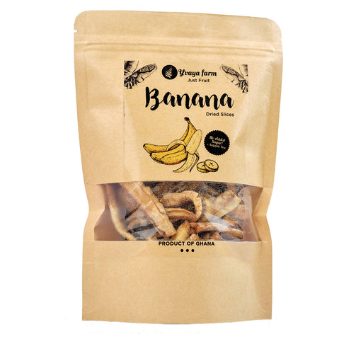 Our Yvaya Farm Dried Bananas are grown in the magnificent Volta Region of Ghana, whose fertile lands are watered by the great Volta River. The local bananas from this area are squat, highly flavourful, and full of naturally occurring nutrients. Energy-packed and fibrous, this dried fruit is perfect as a snack before or after exercise, or whenever you need something to hold you over till your next meal.